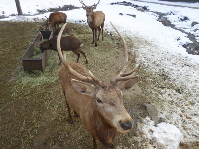 シカはとってもかわいく癒されます。オスのシカにはツノがあり、近くで見るとツノがとても硬くて立派で、重そうでした。