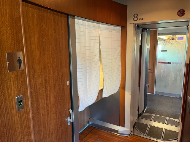 車内のトイレの入り口には、温泉の入り口のような暖簾がかかっていました。 こういう細かな気遣いが、これから箱根温泉に出かける方に喜ばれると思いますね。