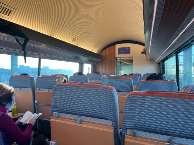 ロマンスカーの内装は落ち着いた色合いでした。久々に乗りましたが、足元も広めです。