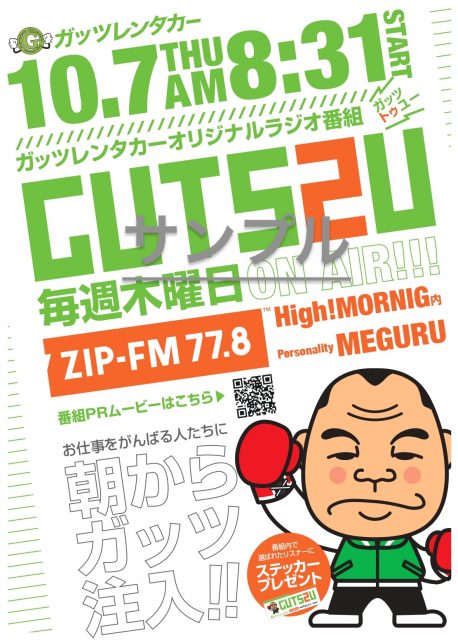 ガッツレンタカーオリジナル番組「GUTS 2 U」が10月7日(木)8時31〜ZIP-FM77.8でスタートします!