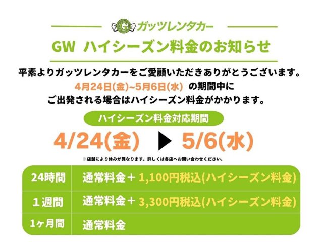 GWハイシーズン期間のお知らせ