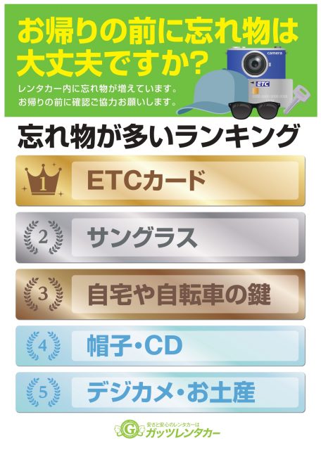 ガッツレンタカーでご利用頂いたお客様の忘れ物をランキングにしました。