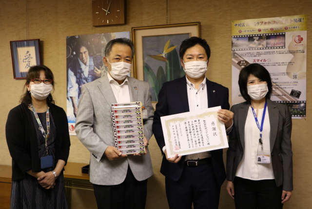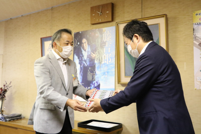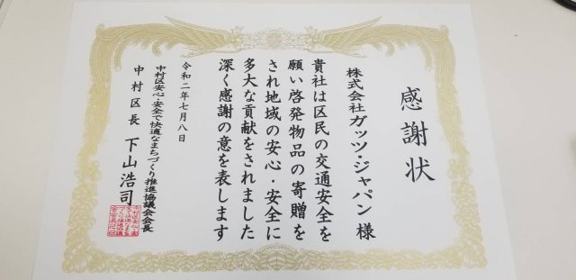 本日、名古屋市中村区役所の区長室にて、弊社代表取締役社長 小嶋より中村区へ反射バンドの寄贈式を行いました。