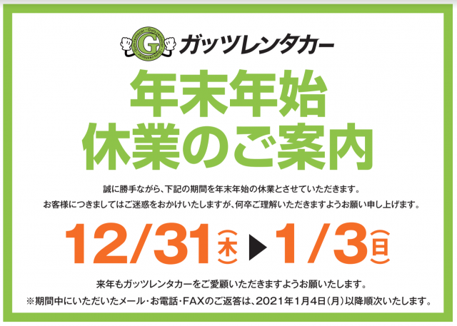 ガッツレンタカー年末年始休業のお知らせです。