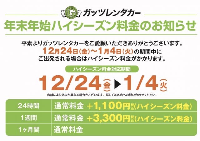 年末年始ハイシーズン期間のお知らせです。