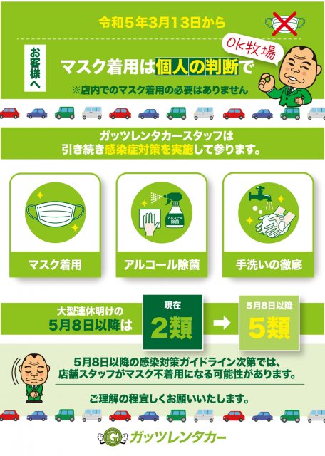 ガッツレンタカーと致しましては、2023年5月8日(月)の5類に移行するまでは、スタッフ接客時のマスクの着用を致します。