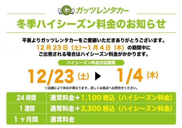 2023年冬季ハイシーズン期間のお知らせ