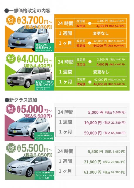 レンタカー価格 一部改定&新クラス追加のご案内