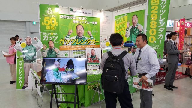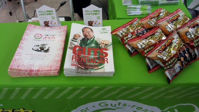 ブースには、ガッツレンタカーのイメージキャラクターガッツ石松氏の等身大も並ぶ中、