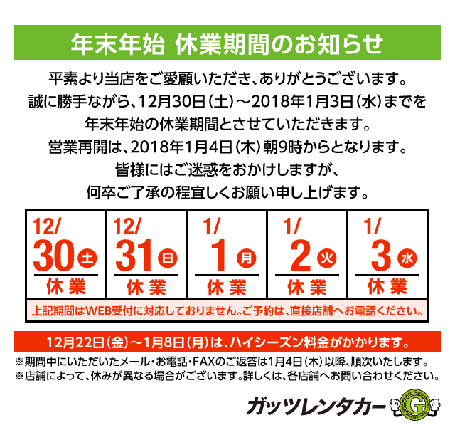 ガッツレンタカー2017年度の年末年始の休業日、ハイシーズンのご連絡です。