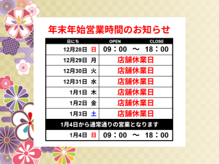 誠に勝手ながら令和07年12月29日~令和08年01月03日までお休みとさせていただきます。