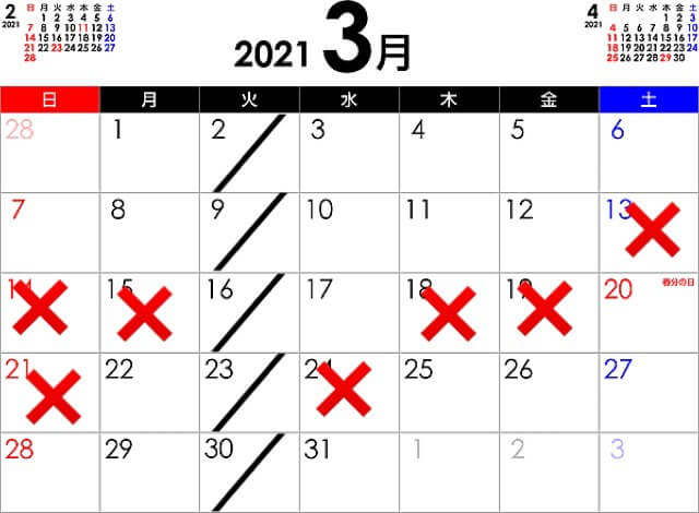 引っ越しシーズンにつき立て込んでいますので上記カレンダーを参考にしてください。