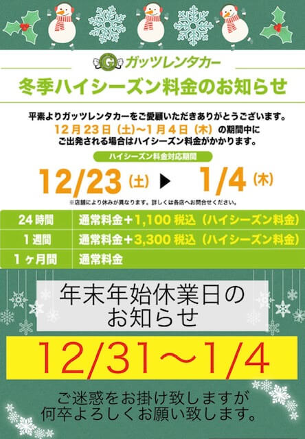 格安レンタカーのガッツレンタカー!GWや夏季、年末年始の営業情報や入庫車情報など、ガッツレンタカー 吹上駅前店から皆様へのお知らせです。
