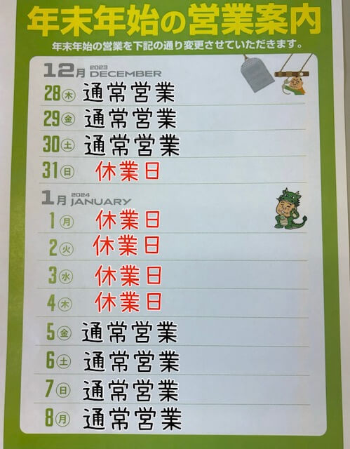 12/31~1/4は休業日です。