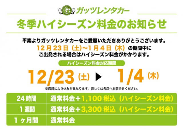 格安レンタカーのガッツレンタカー!GWや夏季、年末年始の営業情報や入庫車情報など、ガッツレンタカー 吹上駅前店から皆様へのお知らせです。
