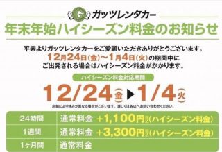 ハイシーズン期間におきまして年末年始も重なり、お車の空きが少なくなるのが予想されます。