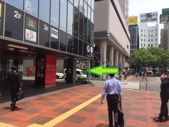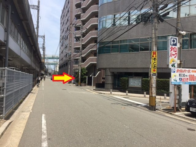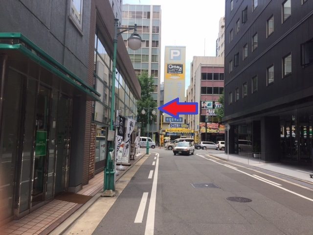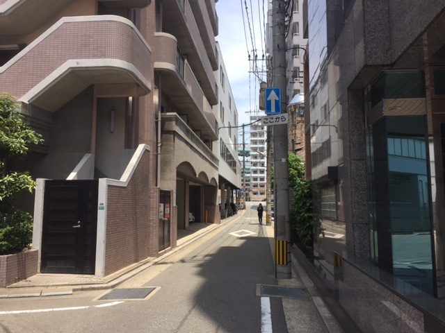 コインパーキング横を通り過ぎて九設ビル奥側の道を斜め右方向に