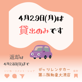 【泉大津(和泉府中)店】4月29日(月)は貸出のみです!※返却は28日(日)まで