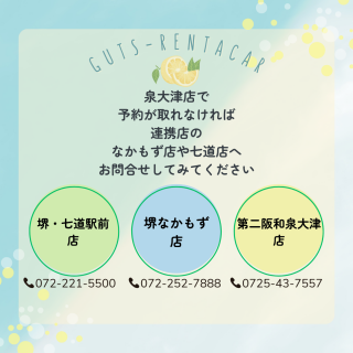 格安レンタカーのガッツレンタカー!GWや夏季、年末年始の営業情報や入庫車情報など、ガッツレンタカー 第二阪和泉大津店から皆様へのお知らせです。