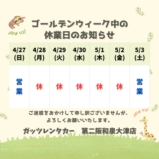 【泉大津(和泉府中)店】ゴールデンウィーク休業日のお知らせ
