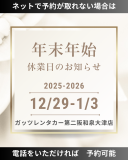 格安レンタカーのガッツレンタカー!GWや夏季、年末年始の営業情報や入庫車情報など、ガッツレンタカー 第二阪和泉大津店から皆様へのお知らせです。
