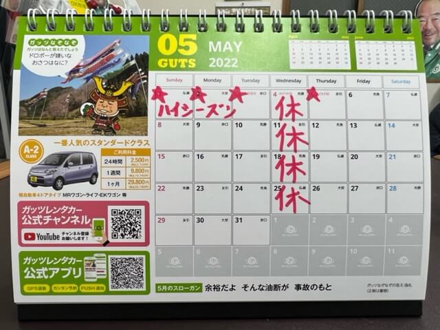 ガッツレンタカー東岡崎駅前店 5月定休日のお知らせ