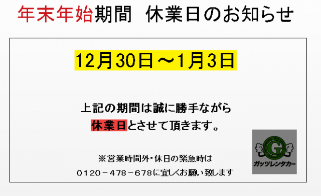 格安レンタカーのガッツレンタカー!GWや夏季、年末年始の営業情報や入庫車情報など、ガッツレンタカー 枚方店から皆様へのお知らせです。