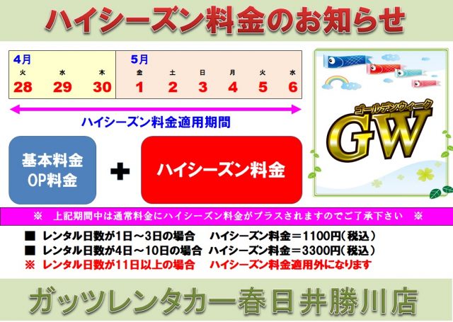 格安レンタカーのガッツレンタカー!GWや夏季、年末年始の営業情報や入庫車情報など、ガッツレンタカー 春日井勝川店から皆様へのお知らせです。