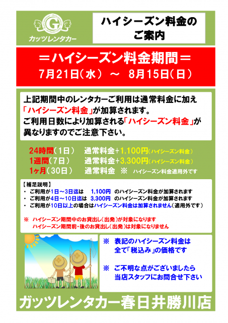【春日井勝川店】ハイシーズン期間のご案内