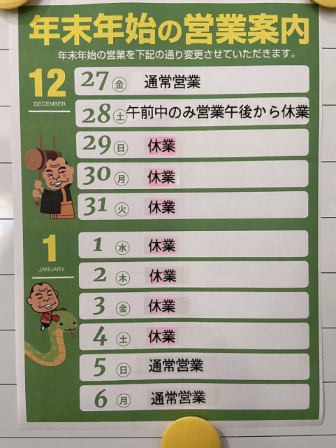 年末年始の営業時間のご案内です。
