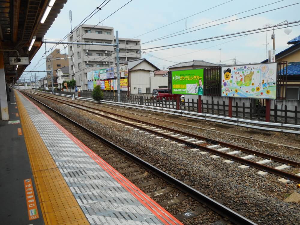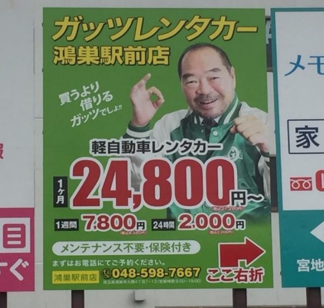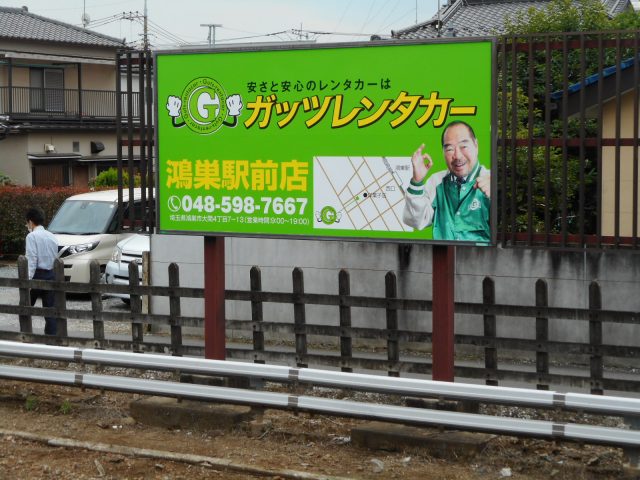 JR高崎線鴻巣駅ホーム線路脇、旧中山道鴻神社交差点の2箇所に「ガッツレンタカー鴻巣駅前店」看板を設置しました。