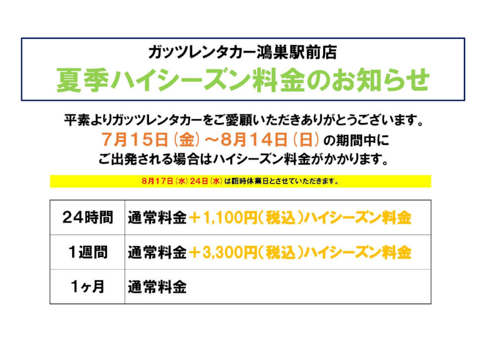 【鴻巣駅前店】夏季ハイシーズン料金のご案内