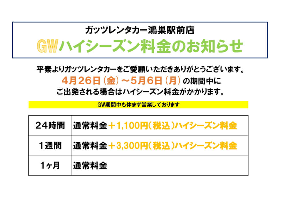 【鴻巣駅前店】GWハイシーズン料金のご案内