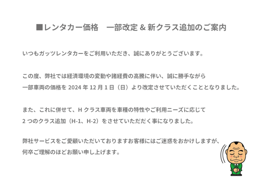 格安レンタカーのガッツレンタカー!GWや夏季、年末年始の営業情報や入庫車情報など、ガッツレンタカー 鴻巣駅前店から皆様へのお知らせです。