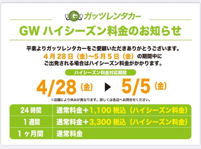 格安レンタカーのガッツレンタカー!GWや夏季、年末年始の営業情報や入庫車情報など、ガッツレンタカー 松戸店から皆様へのお知らせです。