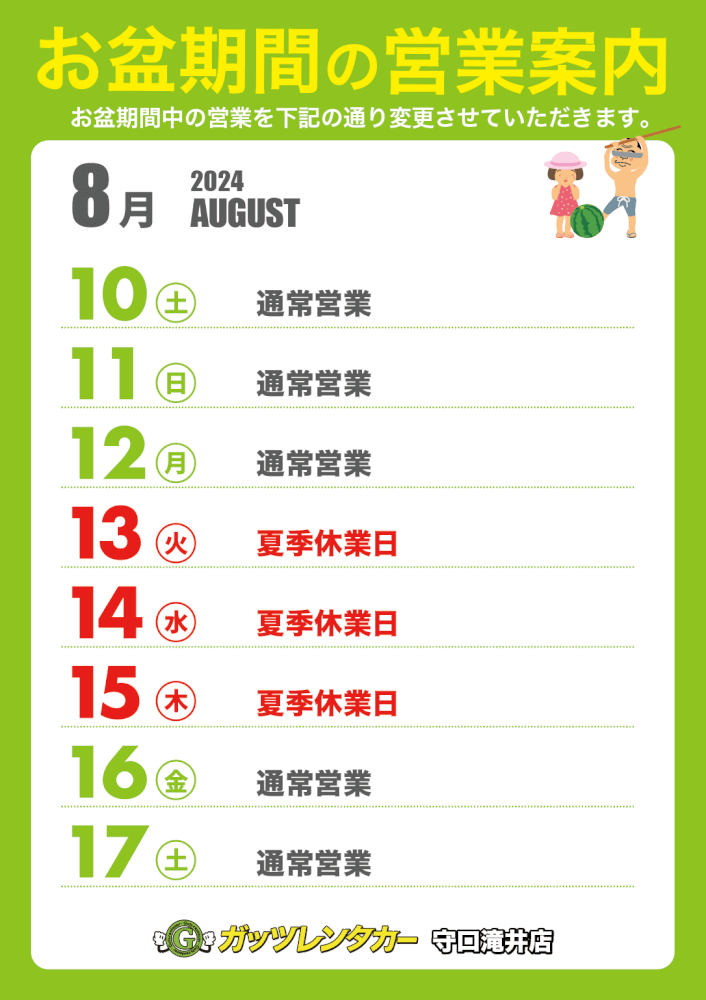 【守口滝井店】 夏季休業日のご案内