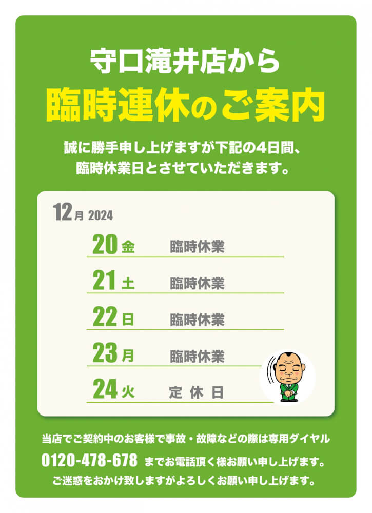 【守口滝井店】臨時連休のお知らせ
