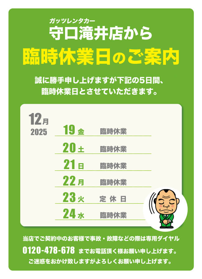 【守口滝井店】臨時休業日のお知らせ
