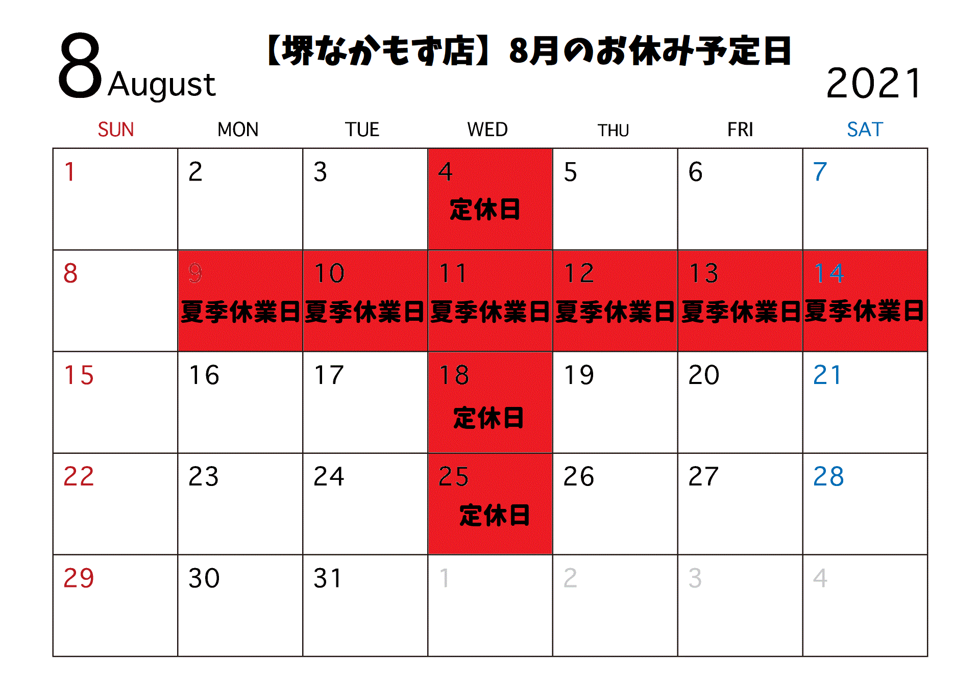 【堺なかもず店】8月休業日と夏季休業日のお知らせ