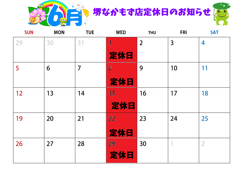 【堺なかもず店】2022年6月定休日のお知らせ❣