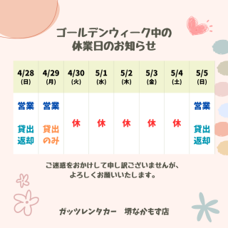 【堺なかもず店】ゴールデンウイーク休業日について