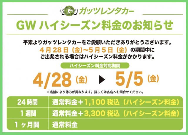 ガッツレンタカー海老名店では、2023ゴールデンウィーク期間中の4月28日(金)〜5月5日(金)まで、新規ご契約のお客様にハイシーズン料金を加算させていただきます。