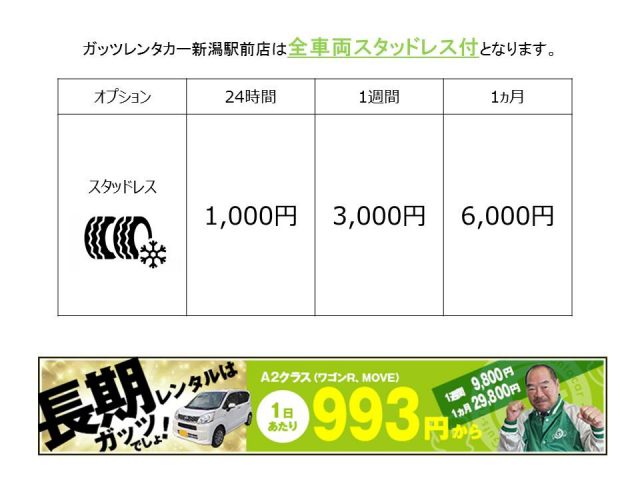 もちろん、ガッツレンタカー新潟駅前店では全車スタットレスタイヤに履き替えを順次行っております。