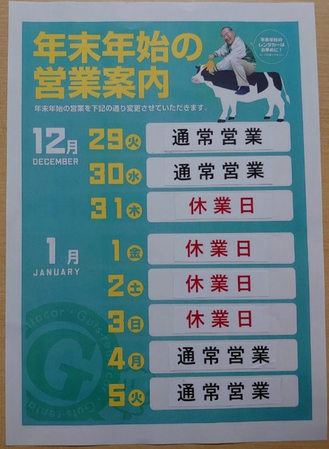 格安レンタカーのガッツレンタカー!GWや夏季、年末年始の営業情報や入庫車情報など、ガッツレンタカー 大分駅前店から皆様へのお知らせです。
