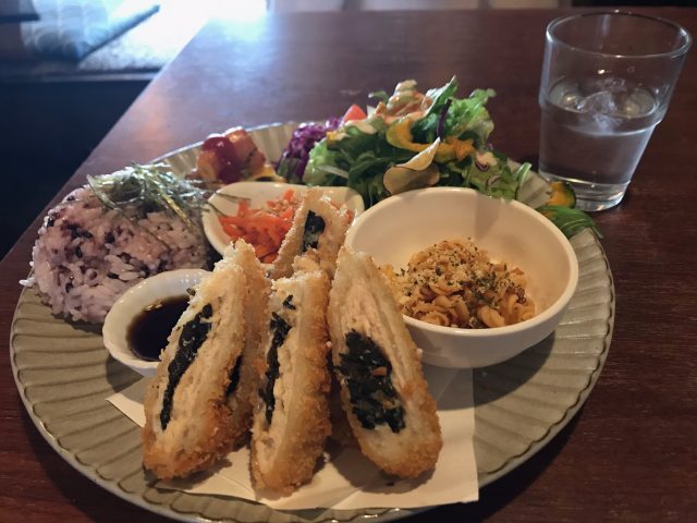 写真は日替わりプレートでこの日は大葉の鶏肉巻きフライ
