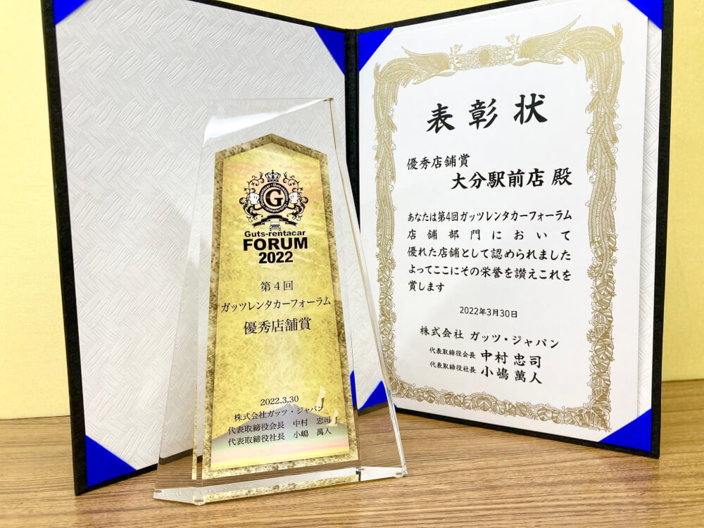 「ガッツレンタカー大分駅前店」が、全国300店舗中5店舗がいただける「優秀店舗賞」受賞を致しました。