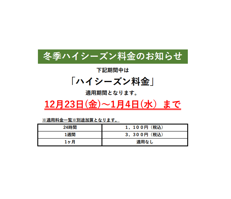 12月23日(金)よりハイシーズン料金が加算されます