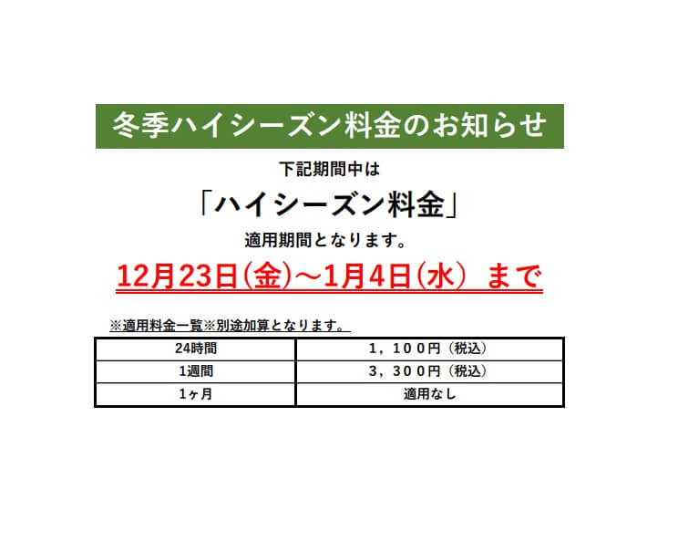 本日、12月23日(金)よりハイシーズン料金が加算されます