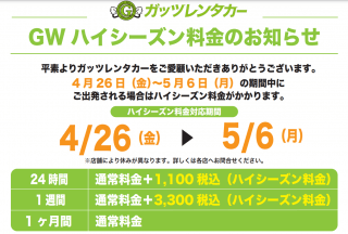 格安レンタカーのガッツレンタカー!GWや夏季、年末年始の営業情報や入庫車情報など、ガッツレンタカー 春日駅前店から皆様へのお知らせです。