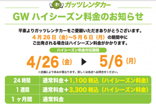 格安レンタカーのガッツレンタカー!GWや夏季、年末年始の営業情報や入庫車情報など、ガッツレンタカー 大阪池田店から皆様へのお知らせです。